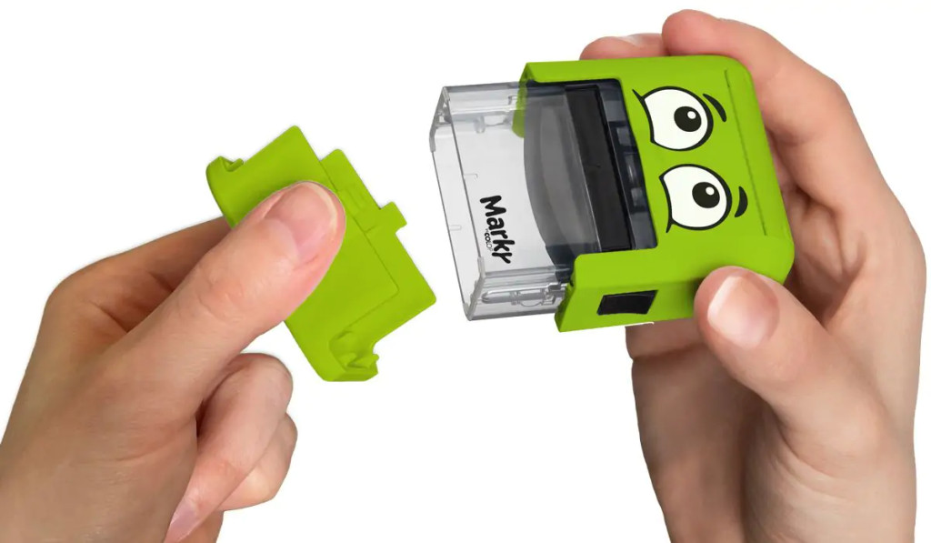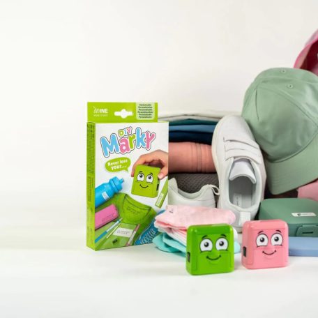 A MARKY kirakós, okos bélyegző végre kiküszöböli a tárgyak bosszantó elvesztését és összekeverését. A zöld Marky Ausztriában készül. A mutatós kartondobozba csomagolt, takaros készlet nemcsak a barátságos arcú bélyegzőt tartalmazza, hanem egy átfogó betűkészletet is az angol ábécé összes betűjével és stílusos piktogramokkal. A készlet tartalmaz még csipeszt, vasalható szalagot sötét szövetekhez és mosogatógépben mosható címkéket.